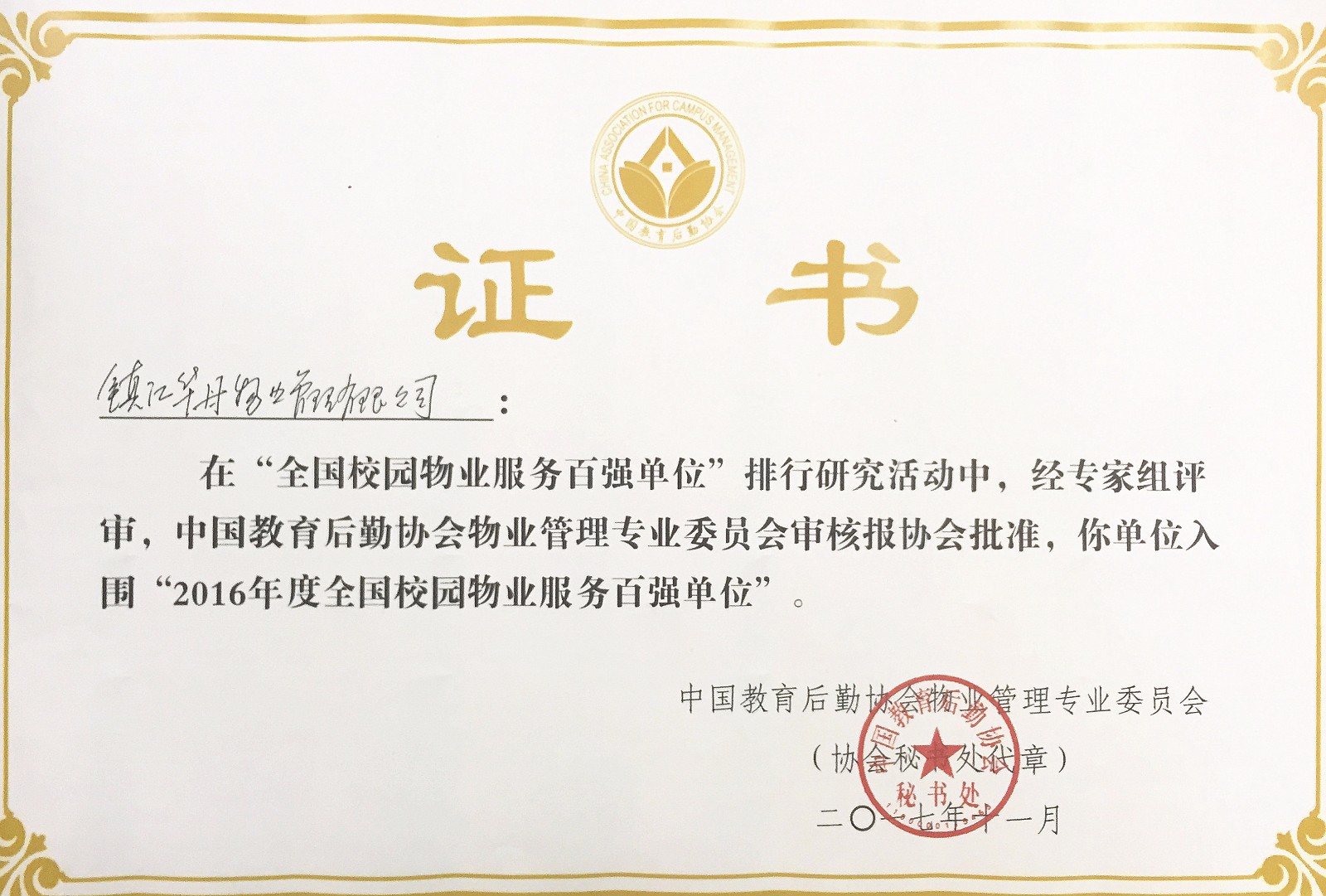 發(fā)展至今,先后榮獲全國校園物業(yè)服務百強單位、中國高校物業(yè)管理工作先進集體、省級物業(yè)服務綜合實力50強、省級示范物業(yè)管理項目、江蘇省放心消費創(chuàng)建先進及示范單位、鎮(zhèn)江市重合同守信用企業(yè)、市級示范物業(yè)管理項目、鎮(zhèn)江市人力資源骨干企業(yè)、鎮(zhèn)江市勞動關系和諧示范企業(yè)等榮譽稱號。